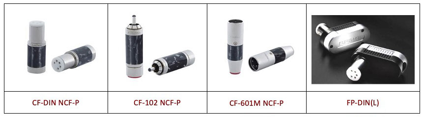 - コネクタ: フルテック製ロジウムメッキ カーボンおよびステンレス仕上げの CF-DIN NCF-Pまたは L-DINおよび CF-102(R) NCF-P α -OCC RCA コネクタまたは CF-601M NCF-P XLR コネクタ